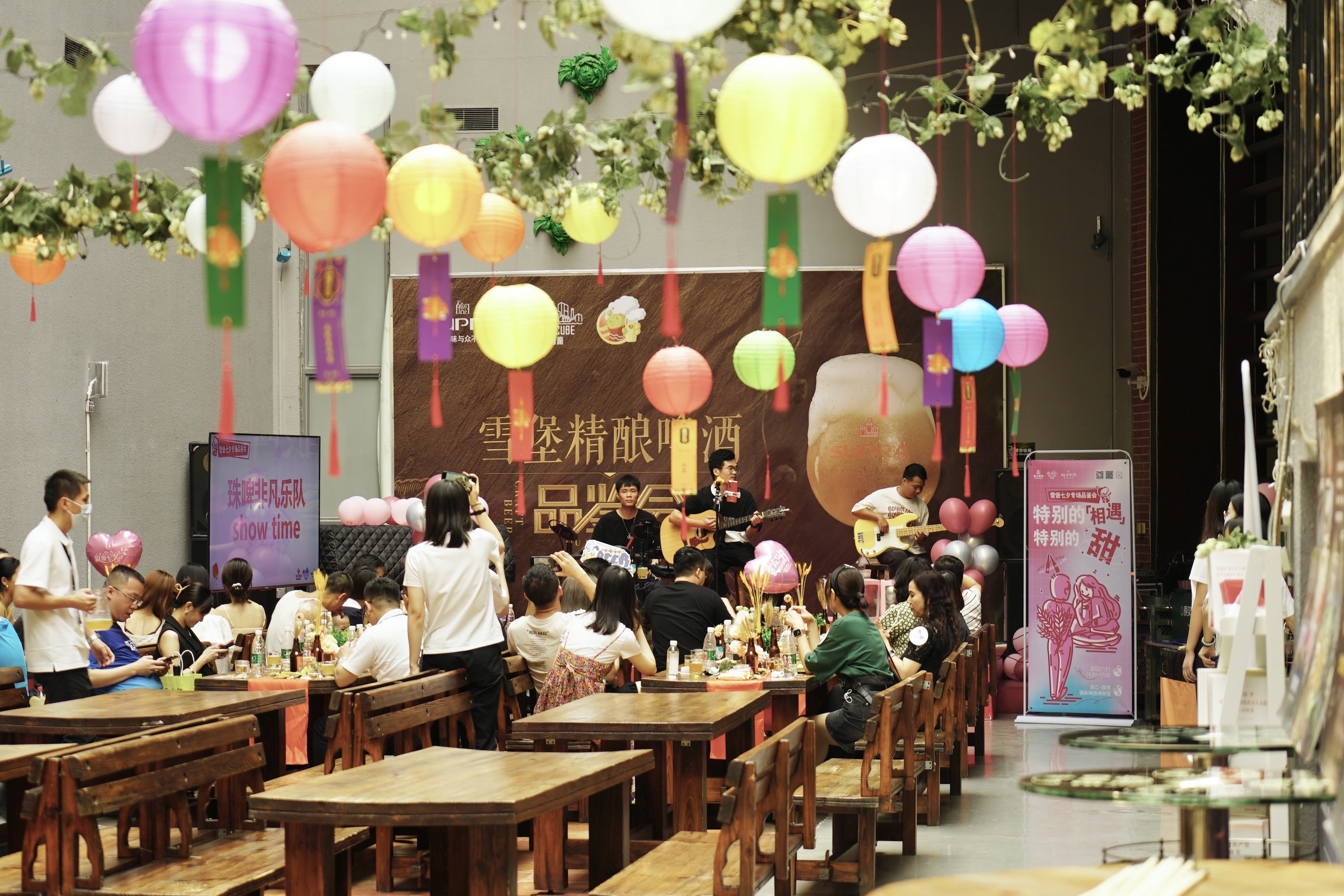 啤酒廠在以往参观博物馆、雪堡精酿品鉴的基础上,积极创新品鉴会形式与流程,一方面结合七夕的节日主题,设置“欢乐投壶”、“趣味灯谜”等传统游园体验,提升市民对中国传统习俗的认同感与体验感,充分发挥珠江-英博国际啤酒博物馆作为爱国主义教育基地的文化性与科普性功能;另一方面增加珠啤非凡乐队演艺板块,并融入“爱的定格”、“心有灵犀”等年轻新潮游戏,打造精酿文化传播新场景、助力雪堡新品推广,为珠江-英博国际啤酒博物馆注入新元素与新活力。