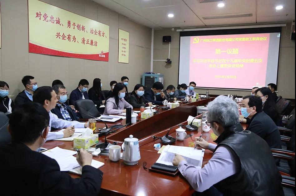 会议第一议题学习习近平总书记在十九届中央纪委五次全会上的重要讲话精神,传达全市宣传部长会议精神;相关单位就珠啤股份及基层党建、干部人事管理、巡察整改、党风廉政建设、群团、疫情防控等工作进行总结,并安排下一步工作。