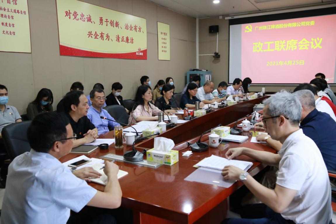 2021年4月25日,珠啤股份党委组织召开4月政工联席会议,进一步推动党史学习教育走深走实,提升党建工作实效。珠啤股份党委书记、董事长王志斌,珠啤股份党委副书记、工会主席吴家威,珠啤股份纪委书记、监察专员廖持亮参会并讲话,吴家威主持会议,党委、纪委职能部门负责人、各党组织负责人约50人现场或视频参加会议。