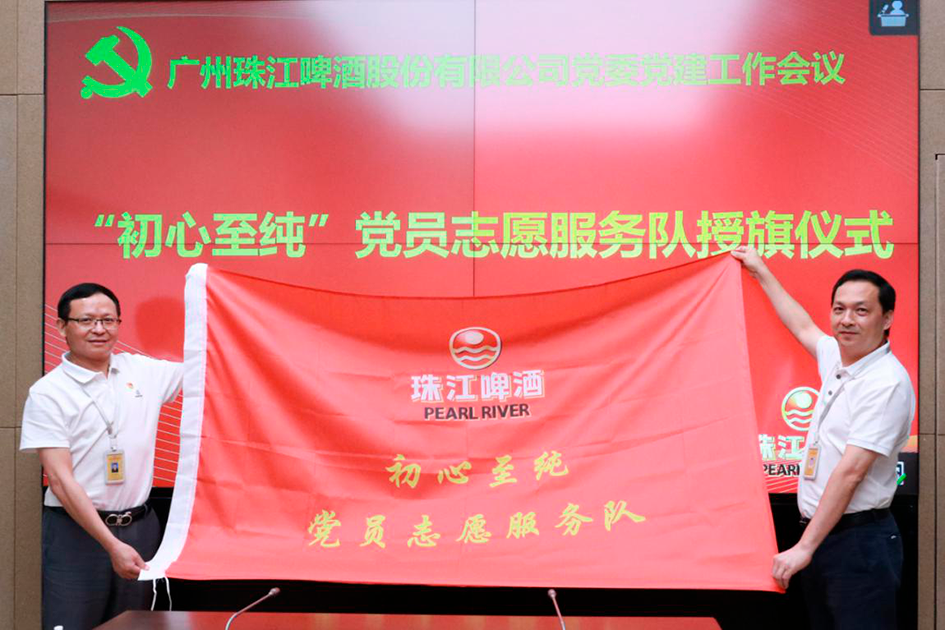 王志斌为珠啤股份“初心至纯”党员志愿服务队授旗。