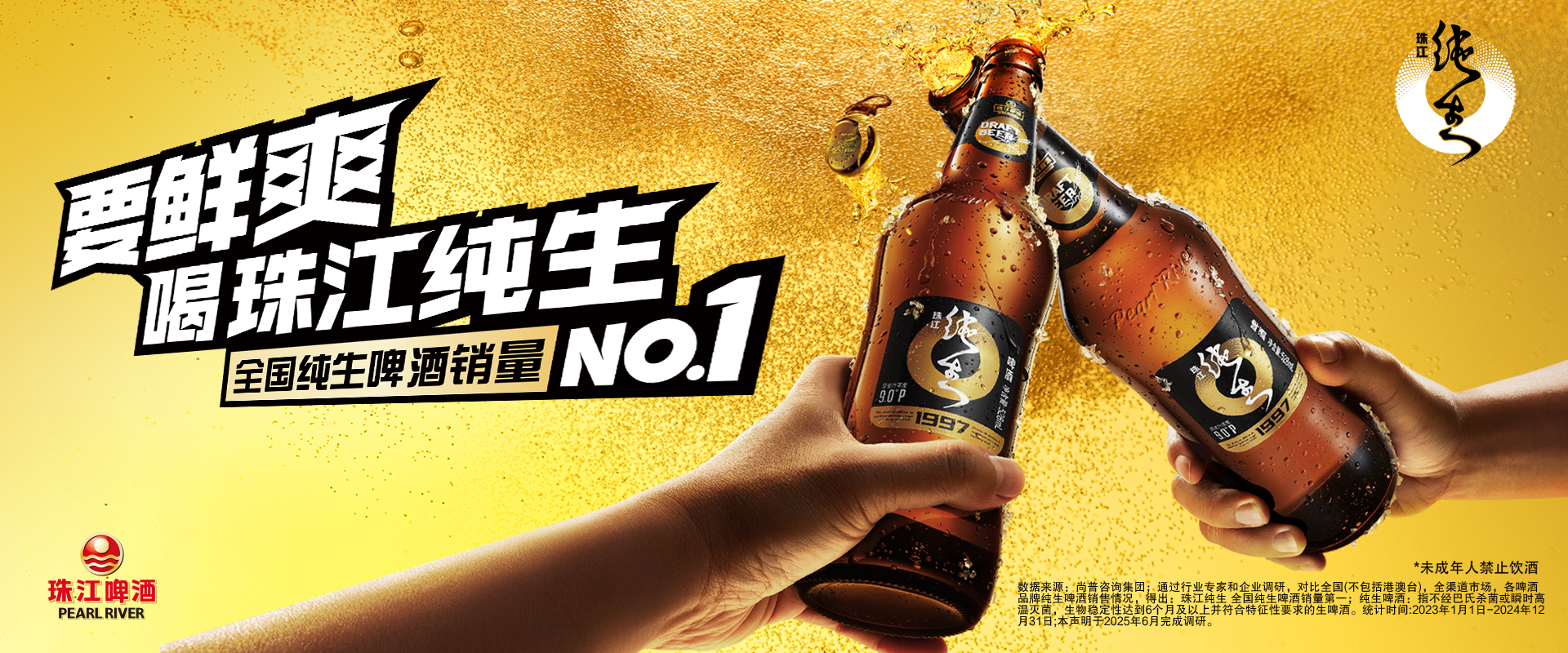 2019年,旗舰型产品珠江纯生1997黑金系列推出市场,设计上采用黑金配色,黄金腰线瓶身设计,迅速成为珠江纯生系列中高端产品的销量担当,开启纯生啤酒行业新浪潮。产品采用皮尔森工艺酿造出香气独特、口味鲜爽的特点,同时酒花纯正、香味浓郁,更荣获中国酒业协会颁发的“2018年度青酌奖酒类新品”称号和“2023年布鲁塞尔啤酒挑战赛(BBC)铜奖”。