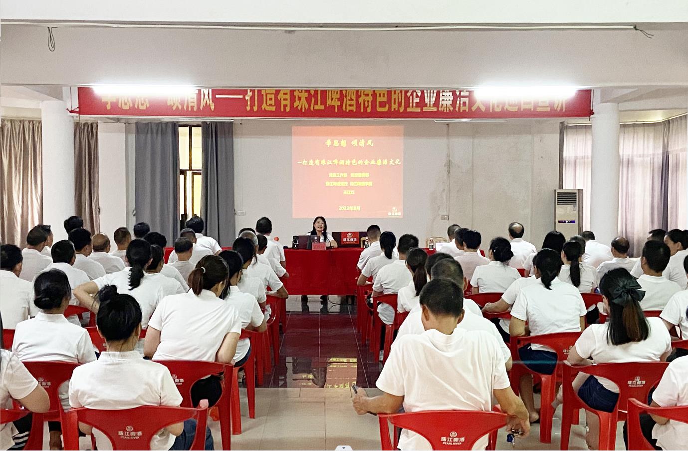 2023年8月9日,珠江啤酒党校副校长、珠啤股份党委工作部部长、党委宣传部部长王江红到新丰公司党支部开展廉洁文化巡回宣讲,新丰公司党支部共80人参会。
