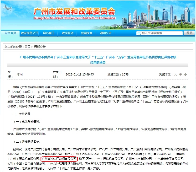 根据广州市发展和改革委员会和广州市工业和信息化局联合下发的《关于“十三五”广州市“万家”重点用能单位节能目标责任评价考核结果的通告》,通报表扬了我公司超额完成“十三五”节能目标,并希望能再接再厉,继续深挖节能潜力,为我市“十四五”节能工作作出更大贡献。