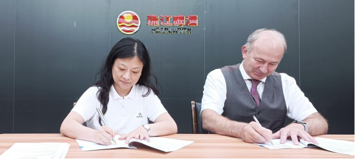 Jingxia Tu,Vice-General Manager and Chief Engineer of Zhujiang Brewery(Left )and Professor Thomas Becker,director of brewing technique research center of the Technical University of Munich (right) signed the contract