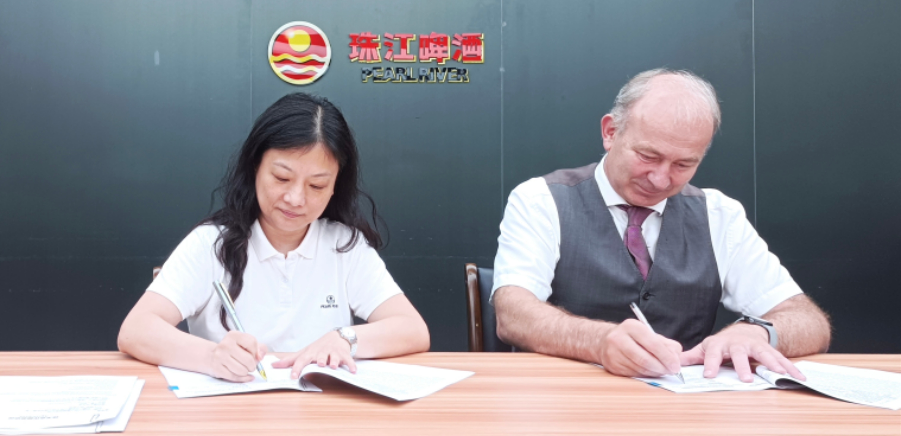 珠江啤酒副总经理、总工程师涂京霞(左一)与慕尼黑工业大学酿造和饮料技术教研室负责人、学术带头人、博士生导师Thomas Becker教授(右一)签约